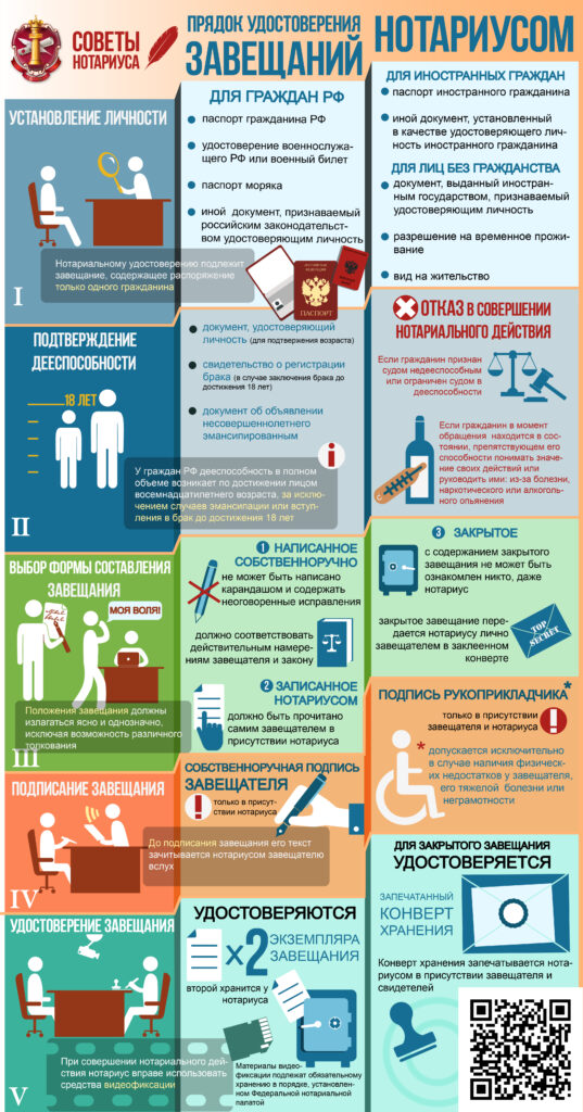 Нотариус обязательно проверяет дееспособность лица, совершающего завещание (в ГК сказано, что завещатель «должен быть полностью дееспособен»), а также законность условий, которые лицо желает включить в завещание. Завещание составляется в двух экземплярах, один из которых хранится у нотариуса. Кроме того, он вносит сведения о составленном завещании в Единую Информационную Систему нотариата (ЕИС). Это делается для того, чтобы в случае, если, например, завещание утеряно, наследники могли восстановить его текст.
